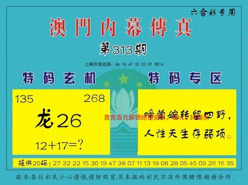 | 313期 | 鸡 | 蓝双 | 4头 | 3尾 | 开龙38 |